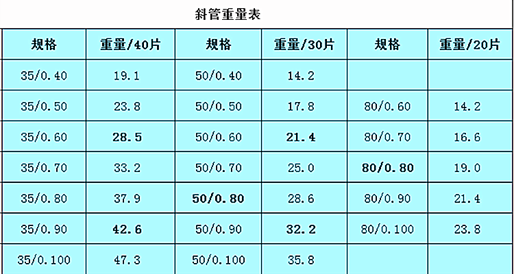 首先以我們常見的聚丙烯材質(zhì)斜管填料為例子,聚丙烯材料的標準密度為920kg/m?。通常的斜管單片尺寸為1000*1000mm,延展為標準方形需求乘以1.3的比例。我們便可以根據(jù)斜管的片數(shù)和厚度計算出標準重量。例如直徑50mm斜管填料,厚度為0.5mm。每立方為30片,那么我們就可以計算得到0.0005*30*920*1.3=18kg。消費運用中經(jīng)常用到的三種直徑規(guī)格35mm/50mm/80mm每立方的標準片數(shù)分別為40/30/20片。大家就可以根據(jù)這個基本計算方式推算出斜管填料標準重量。需求指出的是,計算采用的是全新聚丙烯原料的標準密度數(shù),沒有運用全新料或者原料種類不同者不在討論范圍之內(nèi)。下面為整理的參數(shù)表可以作為參考: